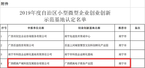 2019年5月21日,根據《關于印發廣西壯族自治區小型微型企業創業創新示范基地建設管理辦法的通知》(桂工信企業(2017)125號)要求,經廣西壯族自治區工業和信息化廳組織專家評審和公示,認定廣西頤高電子商務產業園等13家基地為2019年度自治區型微型企業創業創新示范基地。