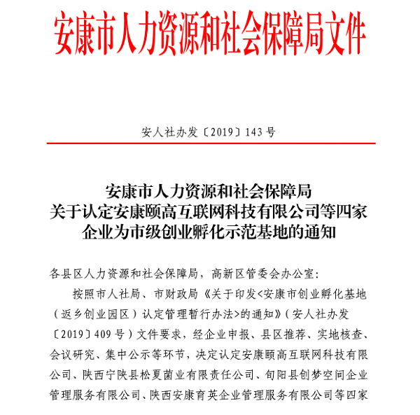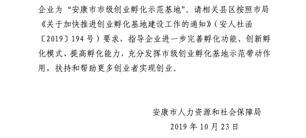 近日,安康市人力資源和社會保障局發文(安人社辦發〔2019〕143號)認定安康頤高夢巢創新工場等4家單位為安康市市級創業孵化示范基地。