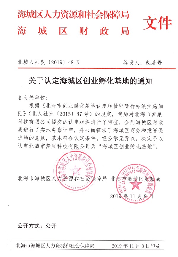 近日,北海市海城區人社局正式發文認定北海數字經濟創業園為“海城區創業孵化基地”。