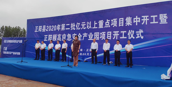 6月28日,河南省正陽縣2020年第二批重點項目集中開工儀式暨正陽頤高應急安全產業園項目開工儀式在正陽縣產業集聚區舉行。駐馬店市政協副主席、正陽縣委書記劉艷麗,縣長王東征,頤高集團副總裁兼頤高新經濟科技總裁顧鵬等領導出席儀式。