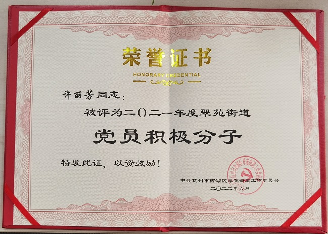 近日,杭州市西湖區翠苑街道召開2022年七一表彰暨“爭星晉位·全域建強”動員大會。街道全體區管干部、機關全體黨員、各社區黨委書記、副書記等人參加會議,頤高集團黨委榮獲“先進基層黨組織”榮譽稱號,許麗芳同志被評為2021年度翠苑街道黨員積極分子,陳貴寶同志榮獲“光榮在黨50年”紀念章,集團黨委直屬二支部黨員藍彩萍同志踴躍參與無償獻血,直屬一支部黨員嚴鵬帥同志積極參加“迎七一 守初心 溫誓詞”集中宣誓活動,各支部黨員以實際行動致敬黨的101歲生日。