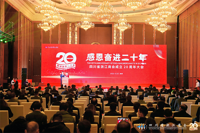 12月22日下午,“感恩奮進二十年——四川省浙江商會成立20周年大會”在成都舉行。中共四川省委統戰部副部長、四川省工商聯黨組書記、常務副主席唐強,四川省政府副秘書長、浙江省駐川工作組組長王峻出席并講話。川浙兩省有關領導、政府相關部門負責人、全國各浙江商會和浙商代表、在川浙江籍商會代表及商會部分會員等近500人出席大會。