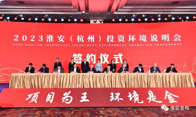 3月24日下午,誠意滿“淮” 共創未來——2023淮安(杭州)投資環境說明會在杭州黃龍飯店舉行,會上集中簽約47個項目,總投資521.87億元,其中工業項目44個,總投資507.87億元。簽約項目中,投資主體為上市企業8家、高新技術企業12家。