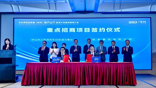 7月9日,由中山市投資促進局、中山市工業和信息化局、中山市人民政府東區街道辦事處聯合主辦的中山市東區街道數字經濟專場招商引資推介會在杭州舉行。中山市人民政府副市長周作德出席并講話,阿里巴巴集團副總裁邢悅致歡迎詞。頤高集團副總裁、文三街科技CEO孫向峰受邀出席會議并簽訂戰略合作協議。