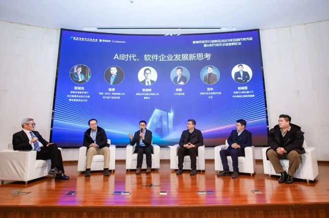 隨后,會上開展了主題為“AI時代,軟件企業發展新思考”的論壇環節,浙商總會數字資產及交易委員會執行主席兼專家委員會主任張旭光主持,網易(杭州)網絡有限公司低代碼產品線總裁陳諤、信雅達科技股份有限公司董事長耿俊嶺 、阿里云技術戰略研究室主任蘇中 、釘釘副總裁林鋒 、英國EGG孵化器CFO,中科頤高億極聯席董事陸城寬分別發表了各自對于AI時代企業發展的思考與見解。