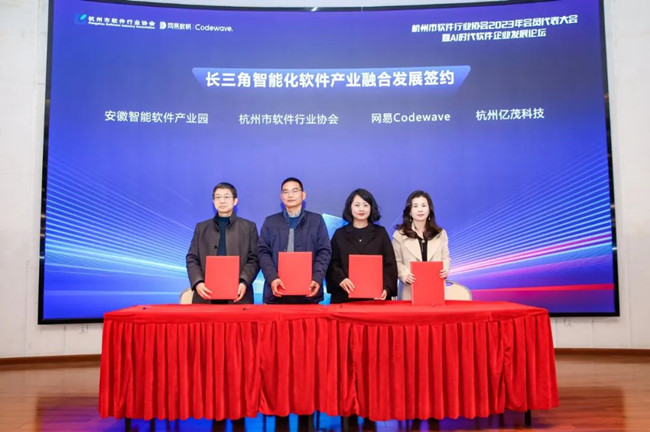 深化長三角產業協同,推動軟件產業高質量發展。會上,由浙江城市學院繼續教育辦公室主任、杭州市軟件協會副理事長陳忠寶、安徽智能軟件園董事長陳方友、網易數帆政府行業負責人林雙飛、億茂科技總經理肖慶作為簽約代表進行了“長三角智能化軟件產業融合發展”的簽約儀式。