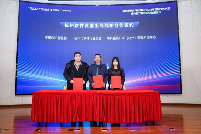 聚焦數字貿易,提升國際競爭力。會上,由浙江城市學院繼續教育辦公室主任,杭州市軟件協會副理事長陳忠寶、英國EGG孵化器CFO陸城寬、中科頤高EGG(杭州)國際科創中心總經理胡蕓芳代表簽約了“杭州軟件英國出海戰略合作”項目。