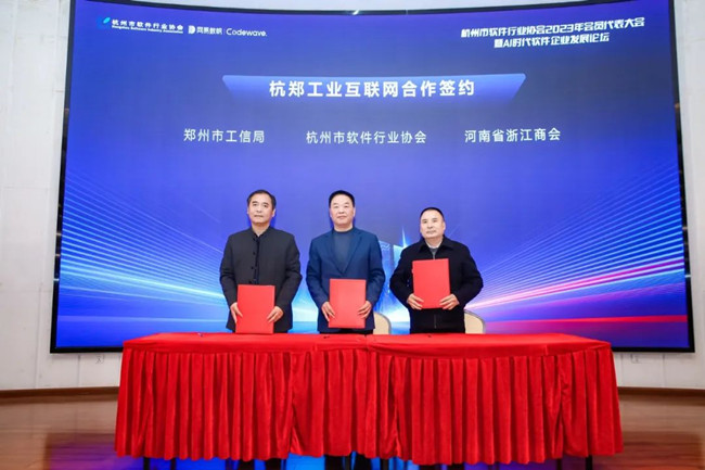 深化合作,攜手同行。頤高集團董事長,杭州市軟件行業協會執行理事會長翁南道、鄭州市工信局黨組成員,副局長曹永濤、河南省浙江商會執行會長許云飛作為簽約代表上臺進行了“杭鄭工業互聯網合作”的簽約儀式。