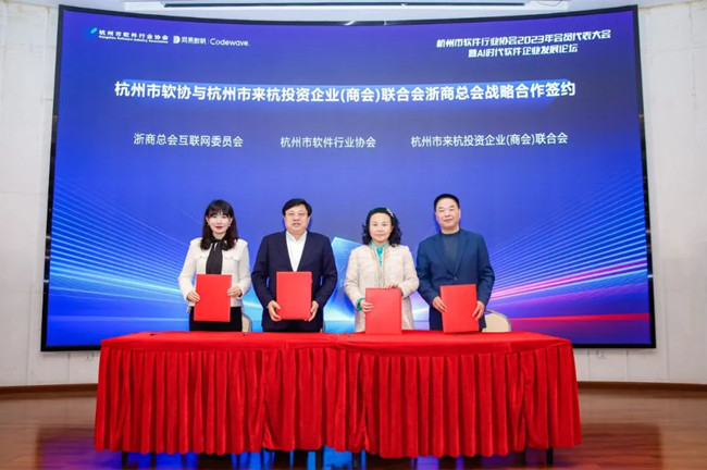 隨后,頤高集團董事長,杭州市軟件行業協會執行理事會長翁南道、浙商總會互聯網委員會秘書長,杭州市電子商務協會秘書長張又雯、聯合會執行會長,杭州市江蘇商會會長祝斌、浙江天津商會會長榮慧于會上進行了“杭州市軟協與杭州市來杭投資企業(商會)聯合會、浙商總會戰略合作”的簽約儀式。