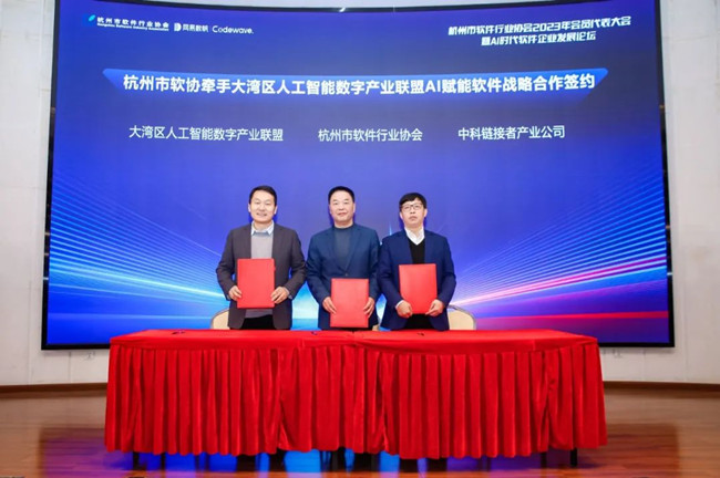 最后,頤高集團董事長,杭州市軟件行業協會執行理事會長翁南道與大灣區人工智能數字產業聯盟秘書長邱道勇、中科鏈接者產業公司聯合創始人涂樂平作為簽約代表上臺進行了“杭州市軟協牽手大灣區人工智能數字產業聯盟AI賦能軟件戰略合作”的簽約儀式。