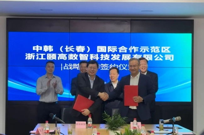 隨后,在吉林省長春市政協黨組書記、主席高志國,中韓(長春)國際合作示范區管理委員會主任劉國濤,頤高集團董事長翁南道,頤高集團副總裁、產城科技總裁黃濤等領導的共同見證下,頤高產城科技副總裁翁國明與中韓示范區管委會副主任張忠成正式簽署中韓(長春)國際合作示范區與浙江頤高數智科技發展有限公司的戰略合作協議。