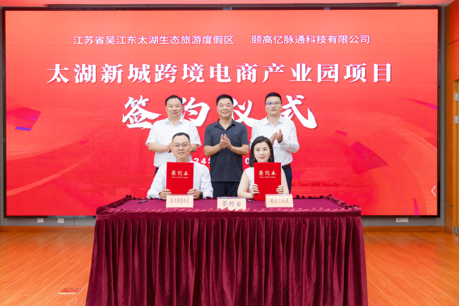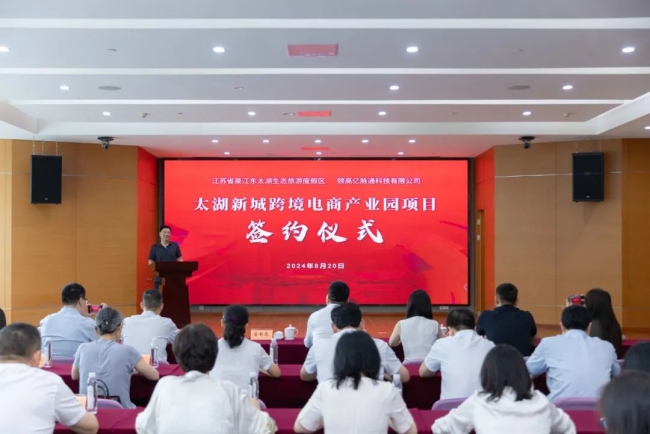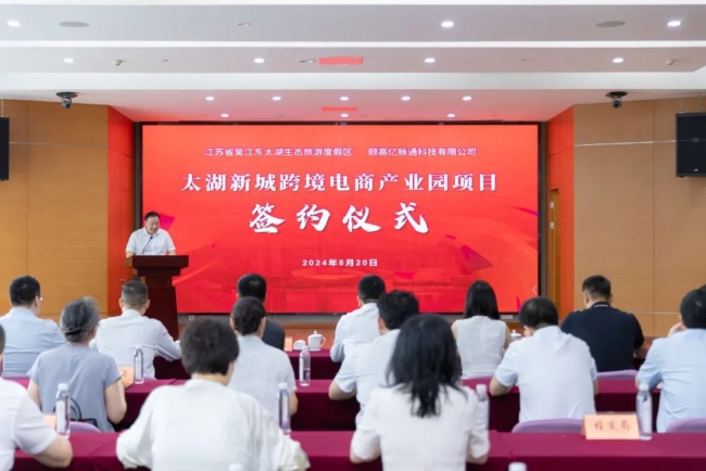 8月20日,太湖新城跨境電商產業園項目簽約正式簽約。副區長方勇,頤高集團董事長翁南道,東太湖度假區管理辦黨委書記、主任蔡建忠出席活動并見證簽約,頤高集團總裁助理、億脈通科技總裁肖慶,東太湖度假區管理辦黨委委員、副主任吳誌代表雙方簽約。吳江區、東太湖度假區相關部門負責同志及頤高集團相關負責人參加活動。