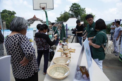 上午10點活動正式開始,首先由富春山健康城管委會領導代表汪洋現場宣讀本次活動的綠色宣言。隨后,參加公益活動的人們帶著事先準備好的工具來到蔣陸家周邊的田間地頭,拾撿白色垃圾。另一方面,村民們積極將家中的廢舊電池帶到蔣陸家禮堂前統一回收,還能免費領取由頤居養生園提供的綠植和養生禮品。