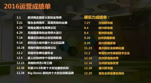 2016年,樓友會布局全國14省,33市,孵化項目612個,為入駐項目融資8.72億,打造出3個國家級眾創空間,2個省級優秀眾創空間,10個省級眾創空間。