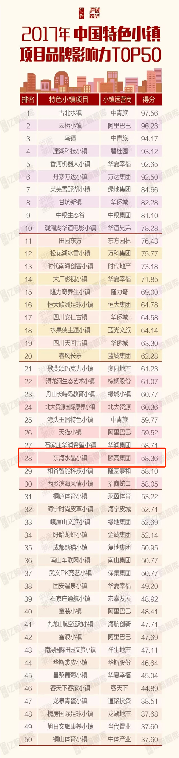 為了特色小鎮行業動態更為透明,并協助理清小鎮發展中企業品牌運營工作思路。億翰智庫聯合產城觀察網本著“科學、公正、客觀”的測評原則,開展《2017年度中國特色小鎮項目品牌影響力TOP50》測評研究工作。通過對媒體報道與企業公告等公開資料進行收集整理等多方式,由頤高集團運營的東海水晶小鎮被評為
