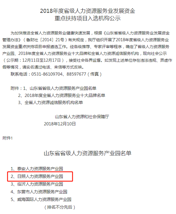 12月18日,為加快推進山東省人力資源服務業健康快速發展,根據《山東省省級人力資源服務業發展資金管理辦法》有關規定,山東省人力資源和社會保障廳組織開展了2018年度省級人力資源服務業發展資金重點扶持項目申報遴選工作。經各級推薦、專家評審等程序,確定了頤高旗下的日照人力資源服務產業園等5家人力資源服務產業園為山東省省級人力資源服務產業園。