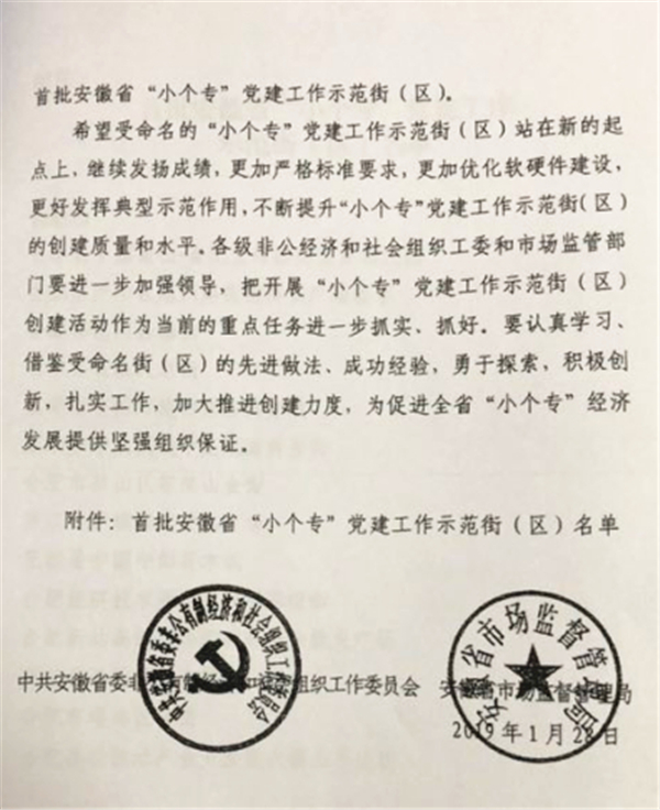 2018年,安徽省在全省范圍內,以各地“小微企業、個體工商戶、專業市場”經濟集中的商業街、商業區為主要對象,開展“小個專”黨建工作示范街區創建活動。計劃打造一批特色鮮明,可借鑒,可復制的“小個專”黨建工作品牌,構筑“小個專”黨建工作風景線,為促進全省“小個專”經濟發展提供強有力的組織保證。