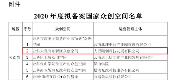 3月24日-3月30日,科技部火炬中心發布《2020年度擬確定為國家備案眾創空間名單的公示》,大理海東新區眾創空間成功入圍并通過公示,躋身“國家隊”,成為大理首家通過“國家級眾創空間”認證的科技型雙創平臺。