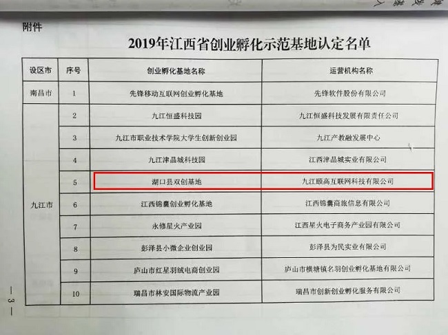 5月7日,江西省人力資源和社會保障廳正式發布《關于認定先鋒移動互聯網等35家創業孵化基地為2019年江西省創業孵化示范基地的通知》(贛人社字〔2020〕176號),在經過申報、受理、評審、公示等環節后,頤高旗下湖口雙創基地被認定為“江西省創業孵化示范基地”。