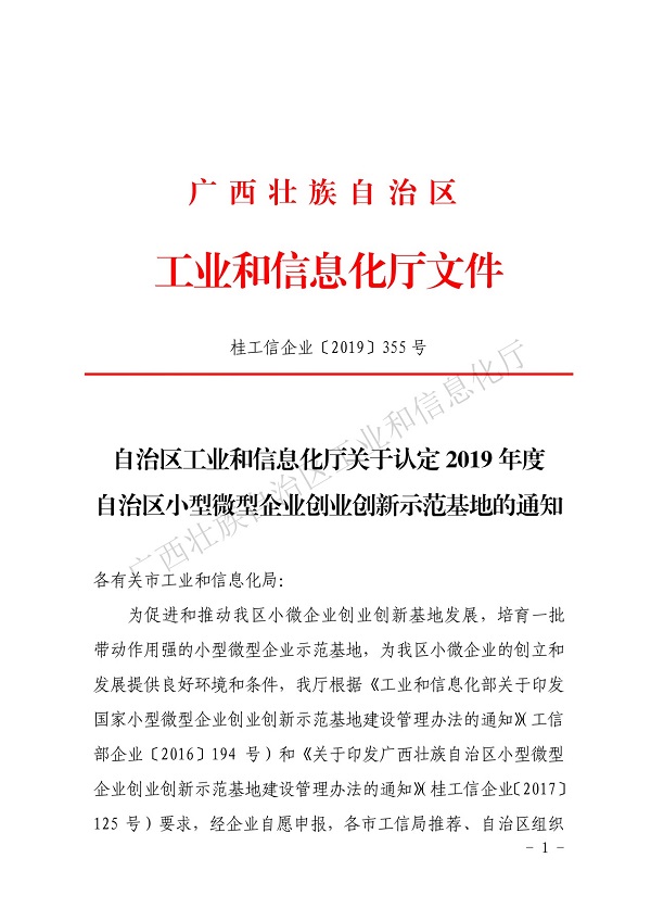 2019年5月21日,根據《關于印發廣西壯族自治區小型微型企業創業創新示范基地建設管理辦法的通知》(桂工信企業(2017)125號)要求,經廣西壯族自治區工業和信息化廳組織專家評審和公示,認定廣西頤高電子商務產業園等13家基地為2019年度自治區型微型企業創業創新示范基地。