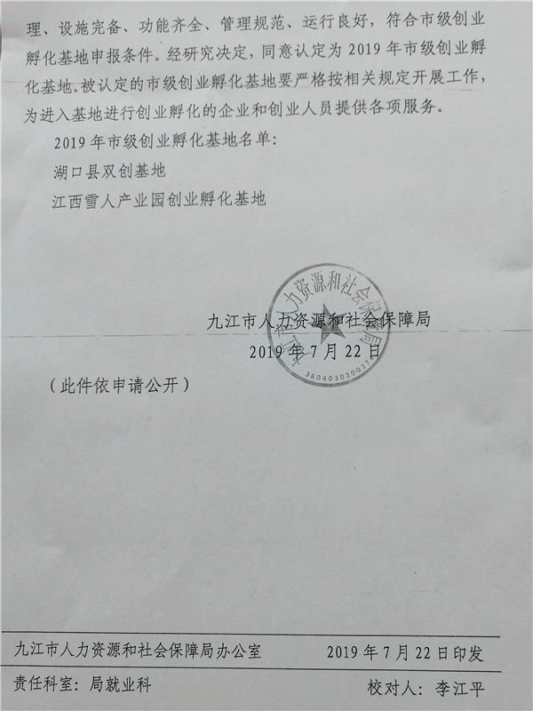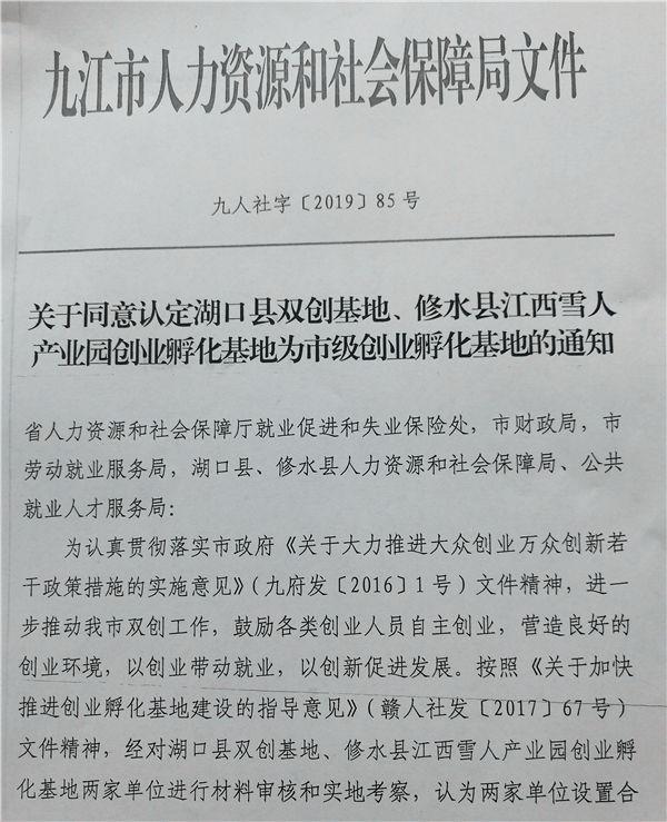 近日,九江市人力資源和社會保障局下發《關于同意認定湖口縣雙創基地、修水縣江西雪人產業園創業孵化基地為市級創業孵化基地的通知》(九人社字[2019]85號),根據專家評審和實地調研論證結果,湖口雙創基地被認定為2019年市級創業孵化基地。