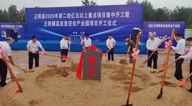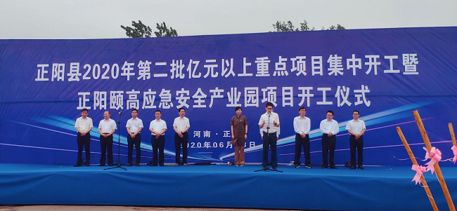 6月28日,河南省正陽縣2020年第二批重點項目集中開工儀式暨正陽頤高應急安全產業園項目開工儀式在正陽縣產業集聚區舉行。駐馬店市政協副主席、正陽縣委書記劉艷麗,縣長王東征,頤高集團副總裁兼頤高新經濟科技總裁顧鵬等領導出席儀式。