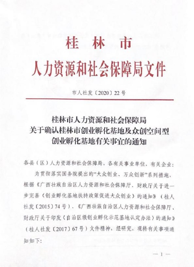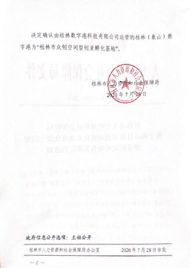 7月28日,桂林市人力資源和社會保障局發布《關于確認桂林市創業孵化基地及眾創空間型創業孵化基地有關事宜的通知》,桂林(象山)數字港成功獲得認定,成為“桂林市眾創空間型創業孵化基地”。