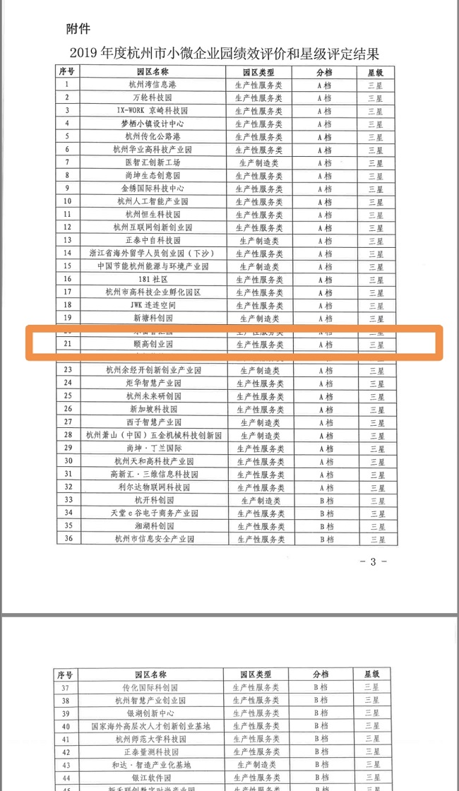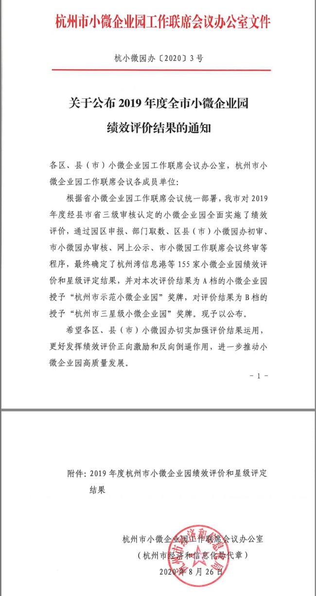 2019年杭州市小微園績效評價結果出爐。根據杭州市小微企業園績效評價細則,主要對畝均稅收、畝均產出、企業培育、公共服務配套、數字化園區建設等五個方面進行評價,績效評定分為A、B、C、D四檔(按全市所有納入評價范圍的小微企業園進行排序),A檔的比例原則上控制在20%(含)以內。杭州頤高創業園獲專家評審組的一致認可,被評定為A檔,同時被授予“杭州市示范小微企業園”榮譽稱號。