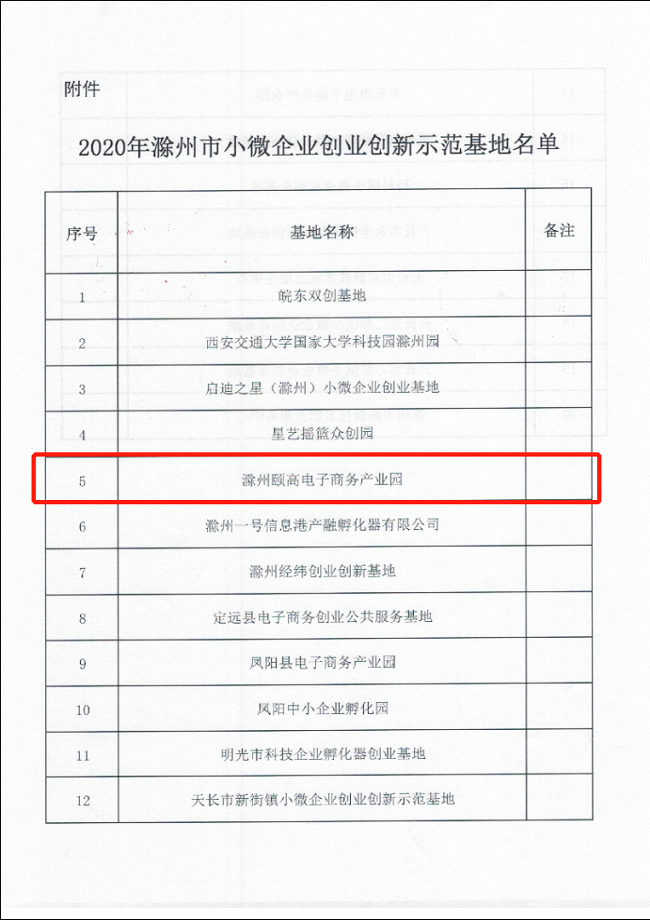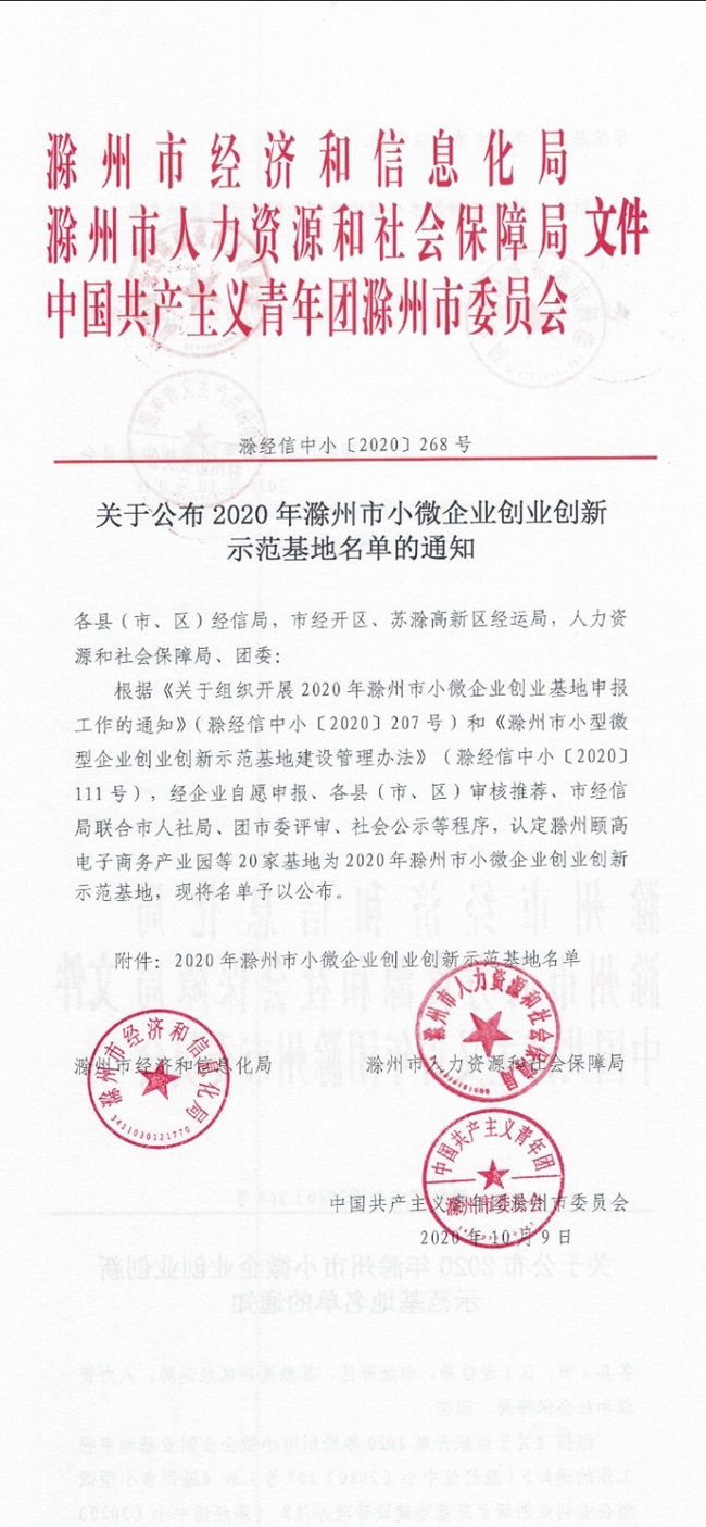 10月10日,滁州市經濟和信息化局公布了2020年滁州市小微企業創業創新示范基地和市級中小企業公共服務示范平臺名單。其中,滁州頤高電子商務產業園獲評為“滁州市小微企業創業創新示范基地”。