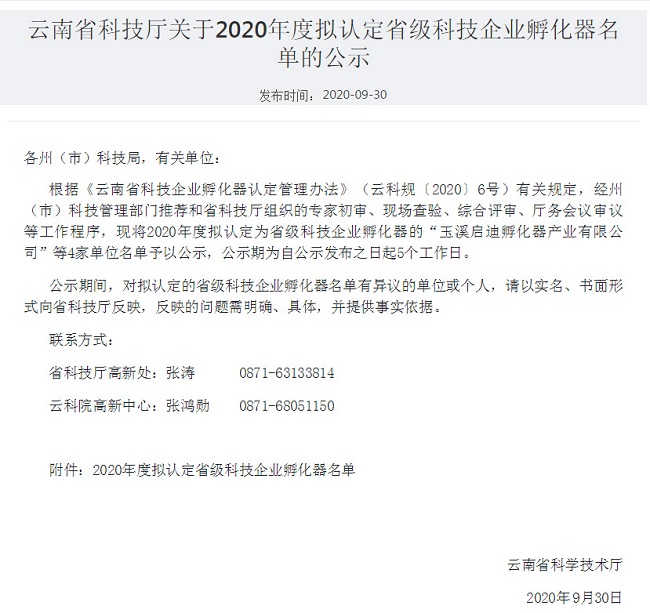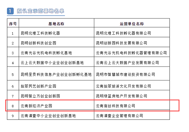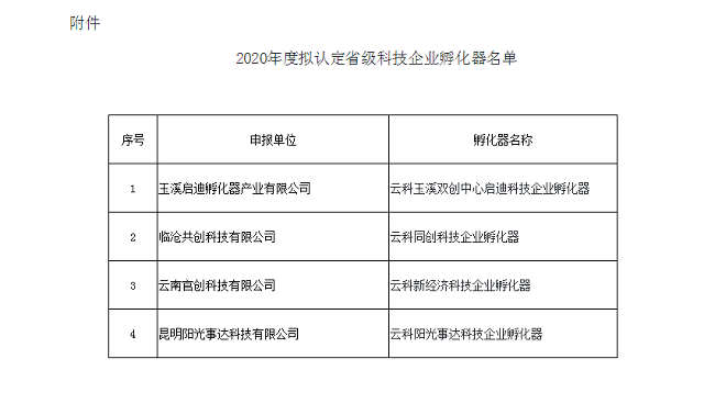 今年8月,云南新經濟產業園獲評“昆明市小微企業創業創新示范基地”。10月15日,再得喜報,獲評為“2020年云南省級科技企業孵化器”。