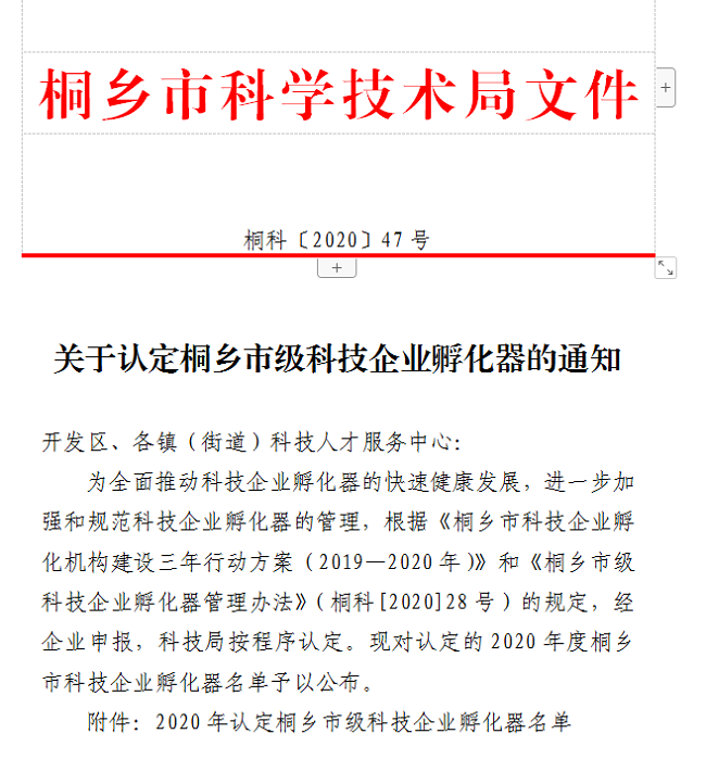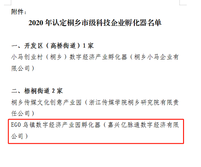 11月16日,桐鄉市科學技術局發布了《關于認定桐鄉市級科技企業孵化器的通知》,頤高EGO烏鎮數字經濟產業園獲評“2020年度桐鄉市級科技企業孵化器”。