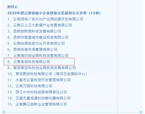 12月13日,根據云南省省委、省政府辦公廳《關于支持民營經濟高質量發展的若干意見》(云發〔2019〕3號)文件指引,經云南省工業和信息化廳組織開展2020年度小企業創業示范基地專家評審及認定,云南新經濟產業園(云南官創科技有限公司)獲評為“2020年度省級小企業創業示范基地”并通過公示期。