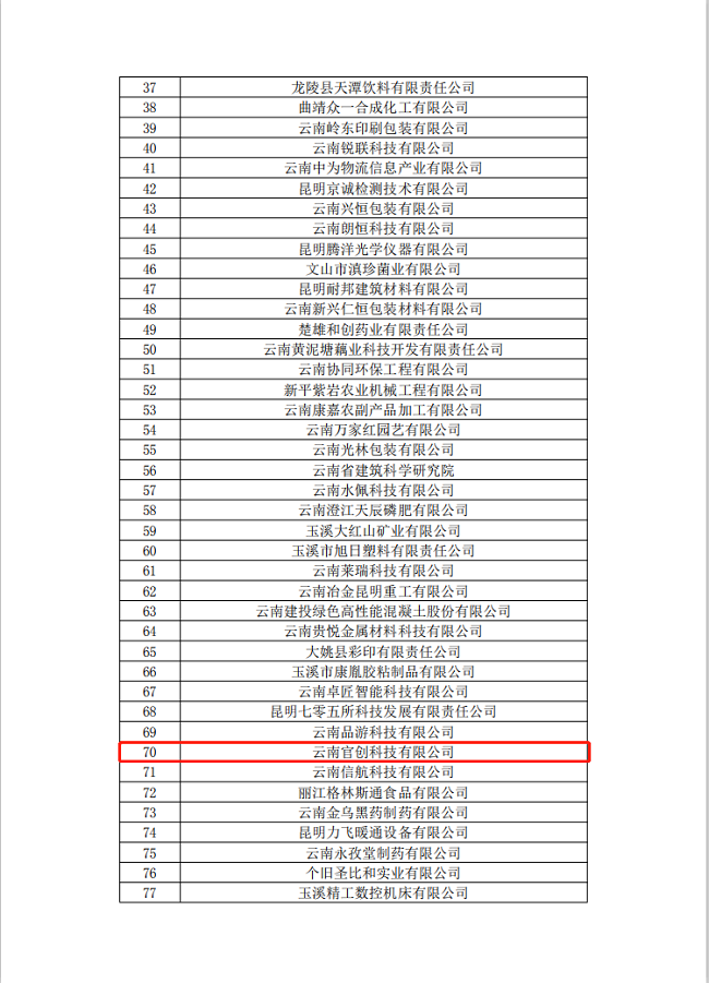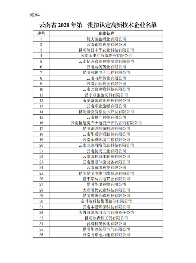 11月23日,全國高新技術企業認定管理工作領導小組辦公室發布《關于公示云南省2020年第一批擬認定高新技術企業名單的通知》,其中云南官創科技有限公司獲國家級高新技術企業認定并于近期通過公示期。
