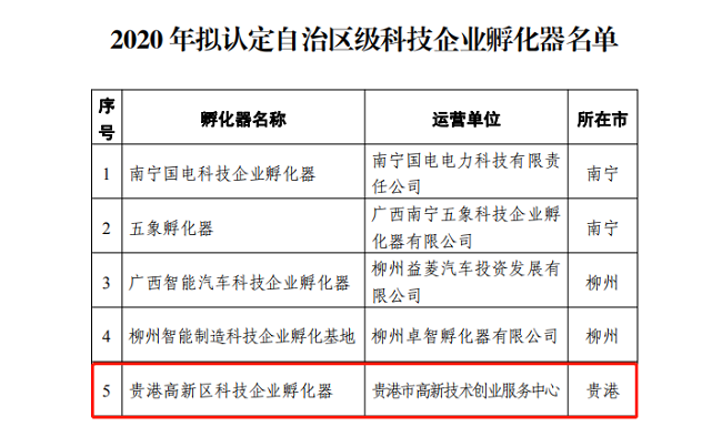 12月15日,廣西壯族自治區科學技術廳發布了《關于2020年自治區級科技企業孵化器認定名單的公示》的通知,貴港高新區科技企業孵化器等5家單位獲評為“2020年自治區級科技企業孵化器”并通過公示期。