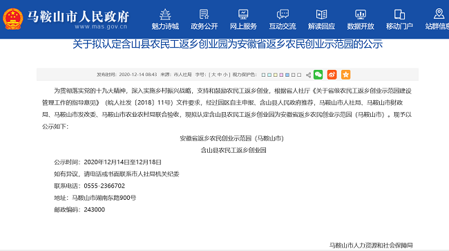 12月14日,馬鞍山市人民政府網站發布了《關于擬認定含山縣農民工返鄉創業園為安徽省返鄉農民創業示范園的公示》,其中,含山縣農民工返鄉創業園獲安徽省返鄉農民創業示范園認定并通過公示期。