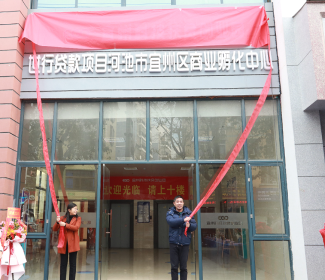(宜州區委常委、宣傳部長、副區長黃玲丹,頤高新經濟副總裁戴金星共同為頤高宜州科技扶貧創業園揭牌)