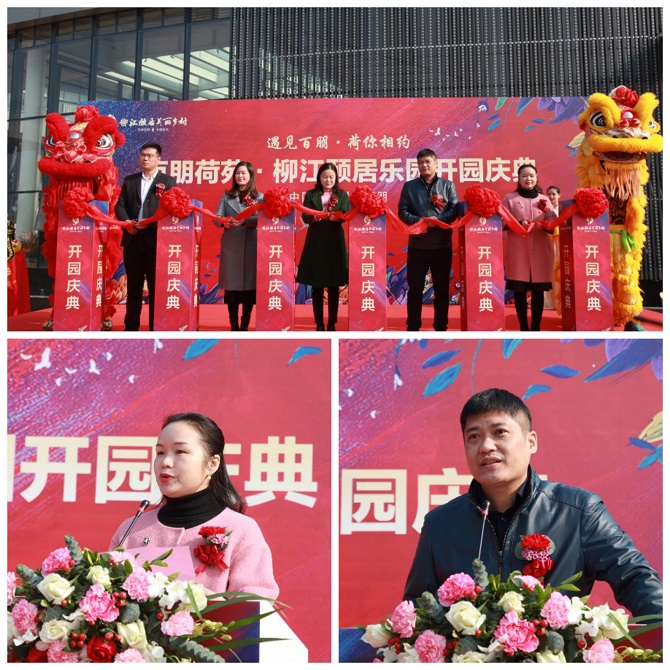開園慶典上,柳江區委常委、宣傳部長彭彩華,柳江區文化體育廣電和旅游局局長韋雪娟,柳江區百朋鎮黨委書記唐大勛,柳州市鑫旺農業旅游投資有限公司董事長韋芫,頤居美麗鄉村CEO葉峰共同為百朋荷苑柳江頤居樂園開園剪彩。