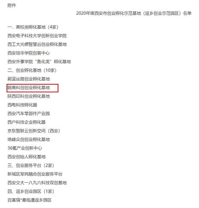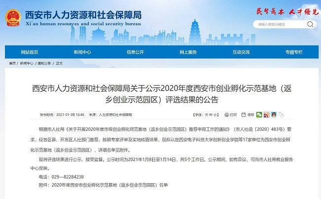 1月15日,西安市人力資源和社會保障局發布了《西安市人力資源和社會保障局關于公示2020年度西安市創業孵化示范基地(返鄉創業示范園區)評選結果的公告》,其中西安頤高蓮湖科創創業孵化基地獲評為2020年度西安市創業孵化示范基地(返鄉創業示范園區)并通過公示期。