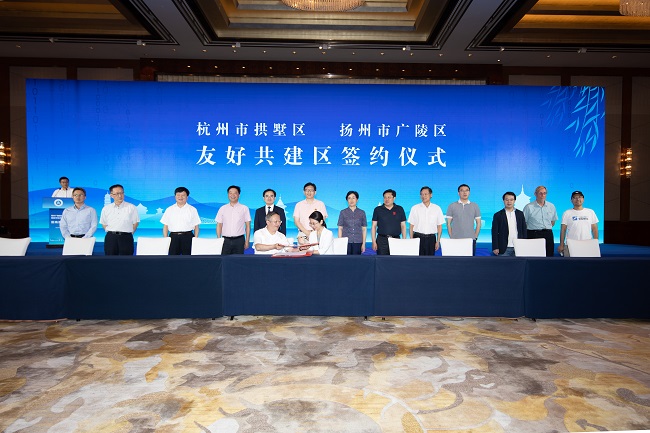 在各位領導及客商代表的共同見證下,杭州市拱墅區人民政府和揚州市廣陵區人民政府簽署協議締結友好城區。隨后,10個優質項目啟動簽約儀式,億茂科技和廣陵新城就頤高新零售產業基地二期擴容項目完成現場簽約。