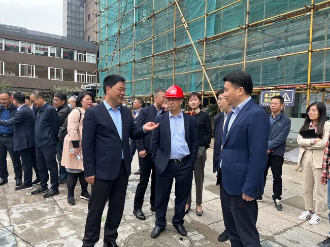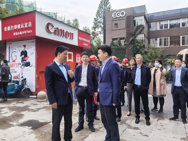 10月28日,浙江省杭州市西湖區黨委副書記、區長董毓民,區委常委高衛星,副區長馬品芳,副區長何加新一行,攜西湖區政府辦、區商務局、區投促局、區城管局、西湖文旅集團、翠苑街道等領導赴文三數字生活街區頤高廣場項目施工改造現場,實地考察了解項目施工改造進度。頤高集團董事長翁南道,文三街科技CEO孫向峰等陪同接待并介紹項目改造進展。