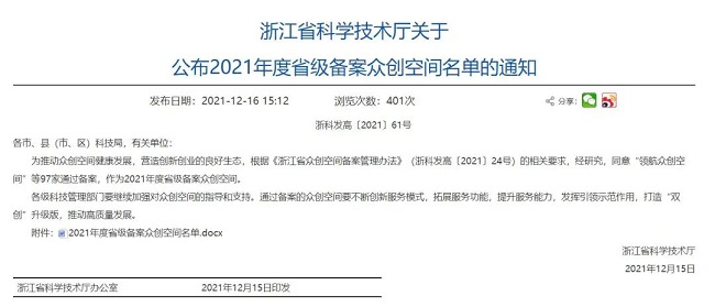 12月16日,浙江省科學技術廳發布《關于公布2021年度省級備案眾創空間名單的通知》,根據《浙江省眾創空間備案管理辦法》(浙科發高〔2021〕24號)的相關要求,由樓友會運營的海智匯眾創空間,被評2021年度省級備案眾創空間。