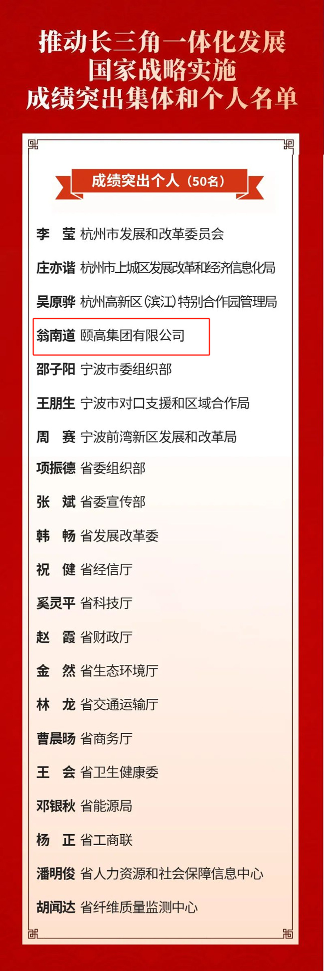 近日,經報浙江省功勛榮譽表彰工作領導小組辦公室同意,對推動長三角一體化發展國家戰略實施成績突出的25個集體和50名個人予以通報表揚。頤高集團董事長翁南道作為唯一一位企業家上榜“推動長三角一體化發展國家戰略實施成績突出個人”名單并被通報表揚。