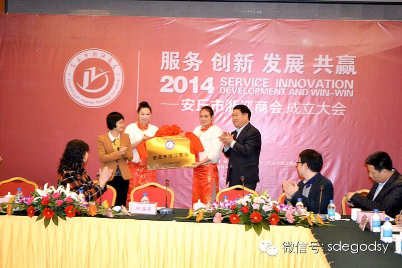 安丘市人民政府副市長邱海芳和安丘市政協副主席、市委統戰部部長于慶滿共同為安丘浙江商會隆重揭牌,安丘浙江商會正式成立,商會將發揚浙商精神,真誠互助,同舟共濟,共同為安丘的發展貢獻一份力量。