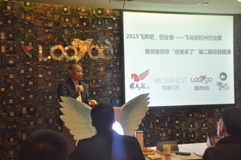 2015年1月2日,由微巢投資和飛馬旅、云咖啡主辦,樓友會承辦的微巢投資“微巢來了”二期項目路演活動暨飛馬旅杭州創業聚于1月2日在樓友會咖啡圓滿收官。本次活動由樓友會王小龍主持,零點研究咨詢集團董事長兼飛馬旅CEO袁岳現場為創業者分享了他的創業故事。本次活動路演的項目涵蓋了消費品設計藝術、動漫畫、在線學習、校園網、旅游包車等各個方面,袁岳和微巢投資、迭代資本、浙商創投、幫實投資和華睿投資等投資機構一同對本次創業者項目進行了觀摩與點評。