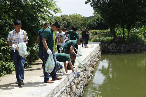 上午10點活動正式開始,首先由富春山健康城管委會領導代表汪洋現場宣讀本次活動的綠色宣言。隨后,參加公益活動的人們帶著事先準備好的工具來到蔣陸家周邊的田間地頭,拾撿白色垃圾。另一方面,村民們積極將家中的廢舊電池帶到蔣陸家禮堂前統一回收,還能免費領取由頤居養生園提供的綠植和養生禮品。