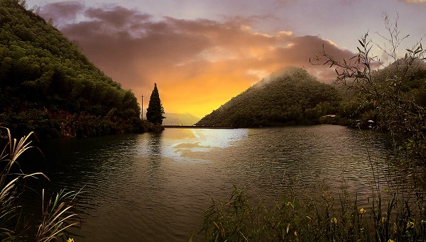 大巴行駛入余村,透過車窗看天空,云紗霧幔,樹木浩渺,低低的山峰在浮云中若隱若現,景色極美。車上的攝影愛好者早已被余村景色吸引住,下車合影留念后就當即開始調試取景。