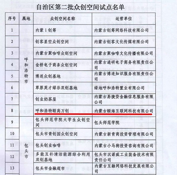 2016年5月9日內蒙古自治區科學技術廳發布了《關于認定自治區第二批眾創空間試點、眾創空間試點培育的通知》。 經科學技術廳在盟市科技局、有關高校及國家級高新區現場驗證、審查推薦的基礎上,經組織專家審核資料、現場考察、行政決策程序,包認定內蒙古自治區第二批眾創空間試點39家,試點培育16家,呼和浩特頤高萬創空間名單在列。