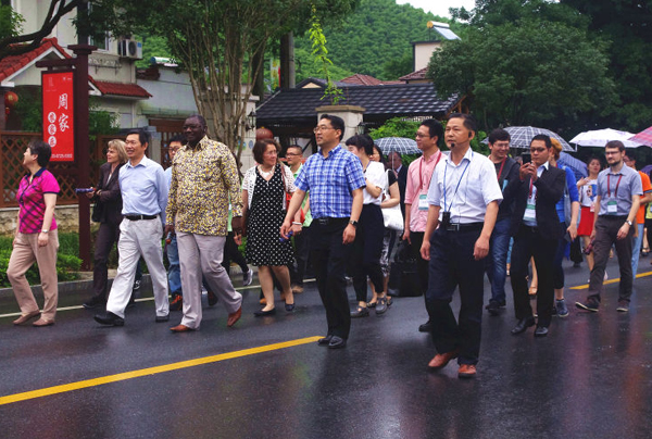 6月19日,二十國集團智庫會議(T20)閉幕后,聯合國教科文組織大會主席、納米比亞工信部副部長斯坦利·穆通巴·西馬塔帶領200多人專家團參觀頤居美麗鄉村余村基地。在村委主任潘文革的介紹下,斯坦利·穆通巴·西馬塔一行觀看了“兩山理論”視頻,并了解了頤居美麗鄉村在余村的建設成果。