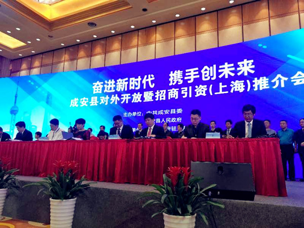 5月3日,成安縣對外開放暨招商引資(上海)推介會順利舉行,成安縣眾創空間、頤高新經濟產業園項目簽約合作,邯鄲市副市長高和平,成安縣委書記薛洪志,縣長殷社林,縣人大副主任姚旭光,頤高互聯網科技股份有限公司總裁助理張燕杰等出席了此次簽約儀式。