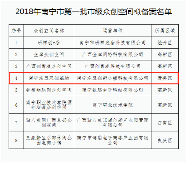 9月28日,根據《南寧市眾創空間備案認定辦法》(南科規〔2017〕5號)規定,經申報、專家評審、現場查驗等流程,共有8個眾創空間為南寧市級眾創空間并進行公示,“南寧東盟雙創基地”成功入選。